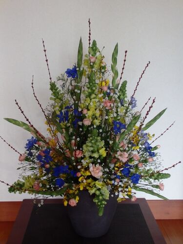 今日は中丹文化会館にお花を届けに行きました。 建国記念の日を祝う京都北部府民の集いがあり、講師にジャーナリストの井上和彦氏を呼ばれるということで、男性に合いそうなイエローやブルーの色味の花をあしらいました。 ご注文ありがとうございました(^…